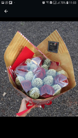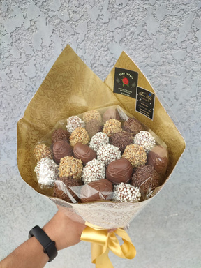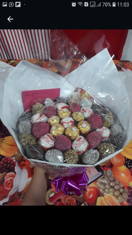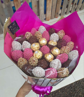 BUQUÊ RAFFAELLO, FERRERO E MORANGOS BANHADOS NO CHOCOLATE
