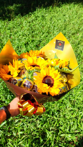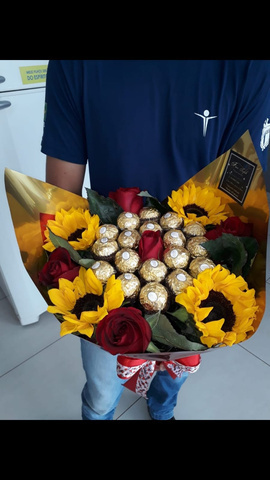 BUQUÊ FERRERO, ROSAS E GIRASSOIS