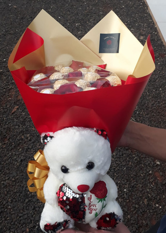 BUQUÊ DE ROSAS,FERRERO E URSINHO PELÚCIA