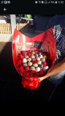 BUQUÊ ROSAS, FERRERO E MORANGOS BANHADOS NO CHOCOLATE