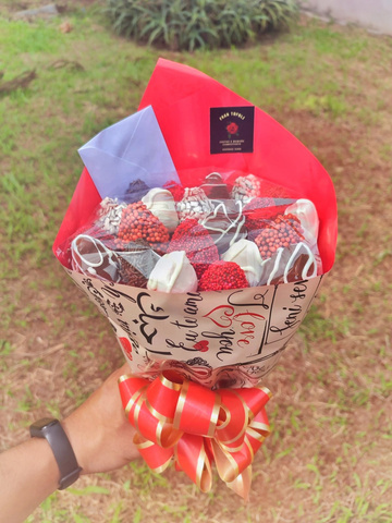 BUQUÊ DE ROSAS E MORANGOS BANHADOS NO CHOCOLATE